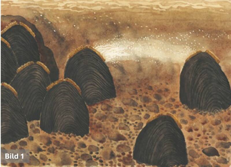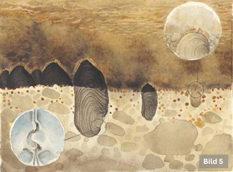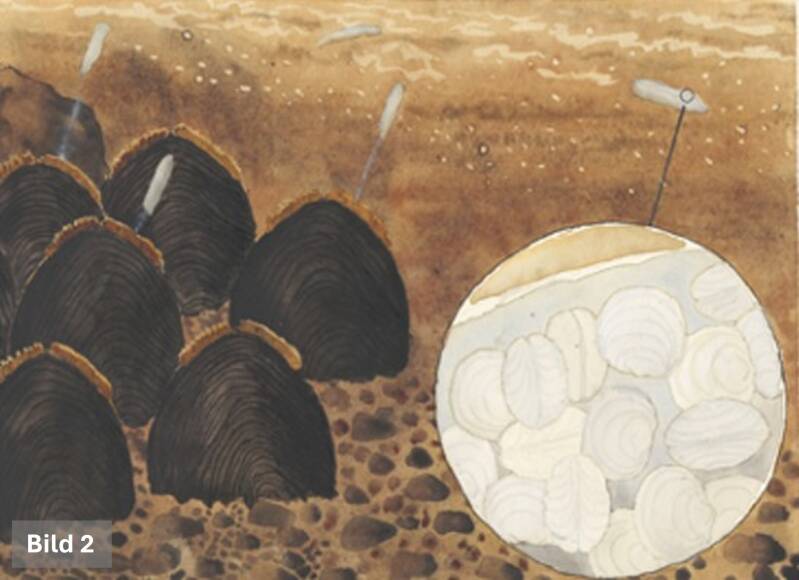 Här börjar en lång och mörk väntan. De första fem åren lever den unga musslan helt gömd i bottenmaterialet, där den äter små partiklar med hjälp av sin grävfot (Bild 5). Först efter åtta till tretton år, när den blivit ca 10 mm lång, vågar den sig upp ur botten för att börja sitt liv som filtrerande organism.