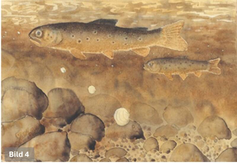 Eftersom dessa små fiskar ofta håller sig på samma ställe, sprider sig flodpärlmusslan i en nästintill omärklig takt mot nya vattenområden. När larven väl fäst sig på gälarna kapslas den in och lever som parasit i 9–10 månader. När den nästa sommar vuxit till ca 0,5 mm, släpper den taget och dalar mot bottnen. Nu krävs det tur: hamnar den på en mjuk sand- eller grusbotten kan den överleva genom att gräva ner sig.(Bild 4).